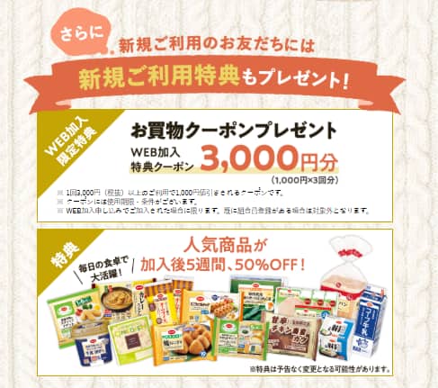 また、新規加入特典として、入会後の配送料(手数料)無料期間があります。(地域により期間の差があり)